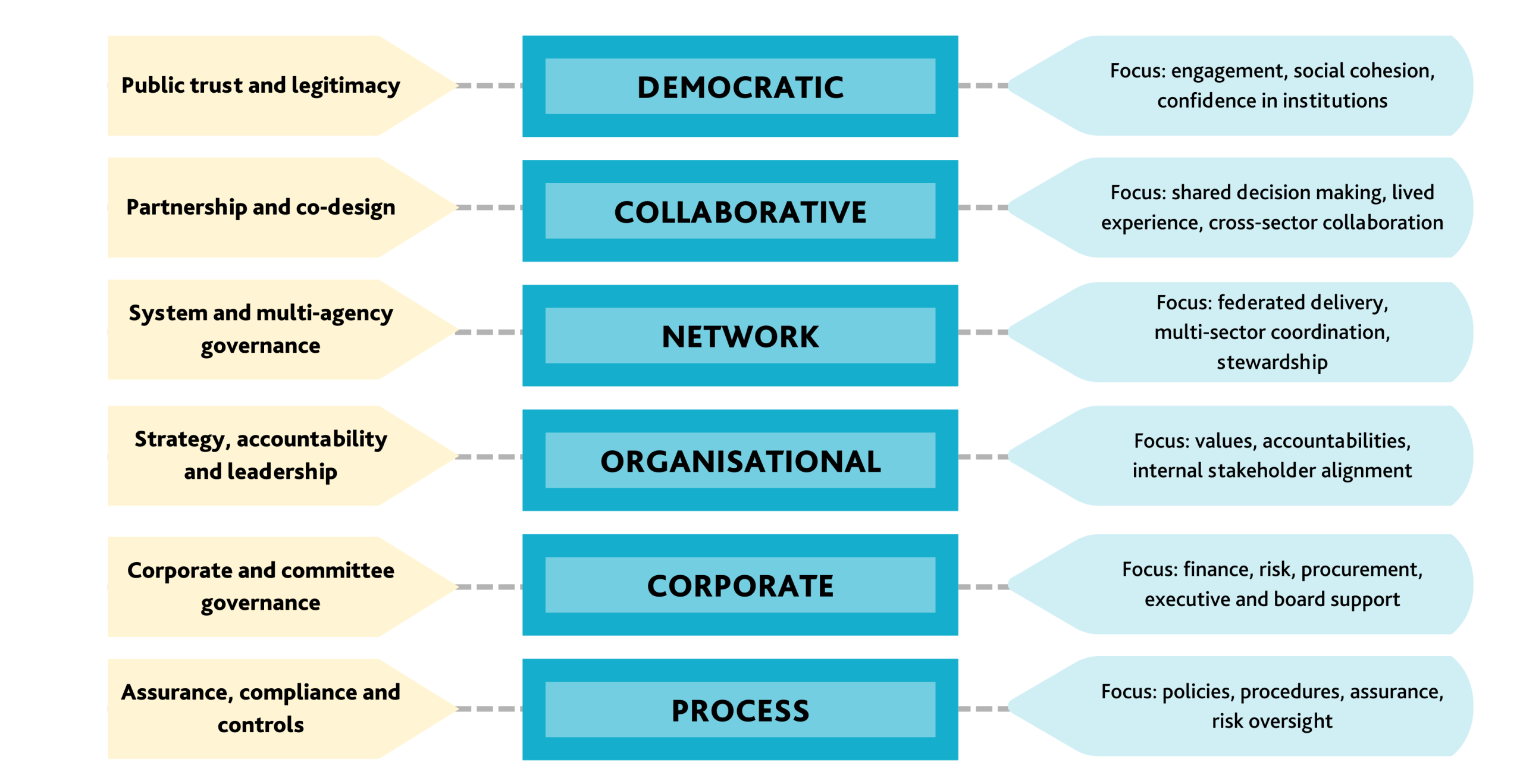 Good governance is more than sound processes – it is everything required to place people at the centre of policy design, service delivery and public outcomes. It spans public trust and engagement, partnerships and networks, organisational leadership, and corporate and committee foundations. This diagram provides an illustrative view of how these governance elements interact across different contexts.